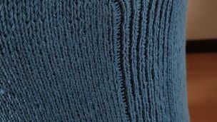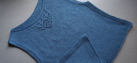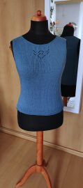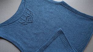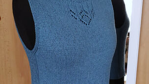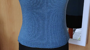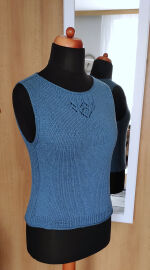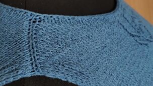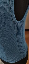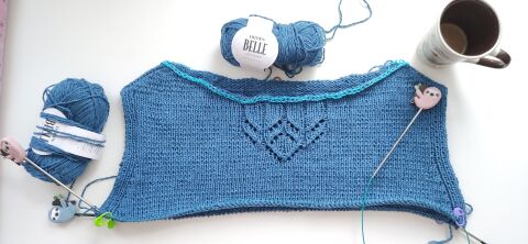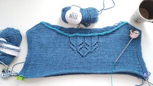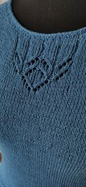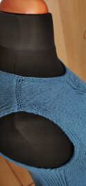 "Pletený od shora dolů. Na výstřih jsem použila provizorní nahození, zkrácené řady a na předním dílu vzor Fjolla. Nahozeno 114 ok."