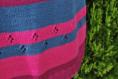 Vynechala jsem u lemu průkrčníku přidávání ok a rovnou nahodila pro velikost M 150 ok. Jehlice 2.5 mm a 3 mm. Na okraji před pružným lemem jsem nepřidala žádná oka. Pro mojí velikost mi přišlo 60 ok navíc tedy opravdu moc!