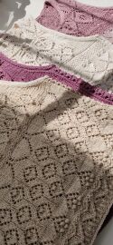 "Horní část se plete shora dolů, nejprve se v řadách plete horní část zad a přední strana a poté se v kruhových okách plete trup. Nakonec se naberou oka kolem výstřihu a průramků pro vytvoření i-cord lemového lemování. Upravila jsem jen některé vzory oproti originálu."